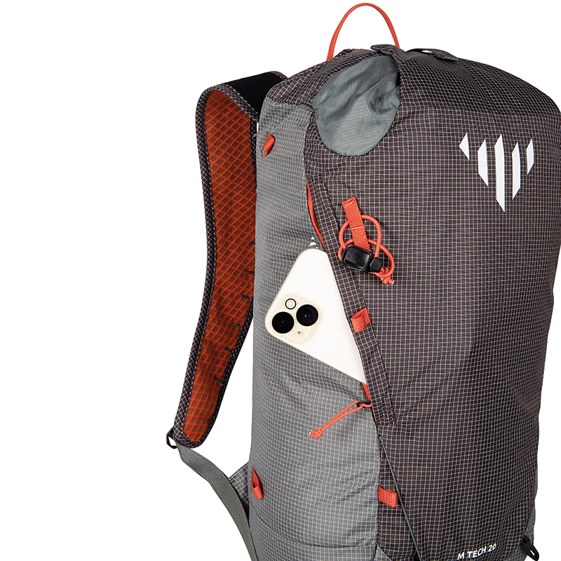 M-TECH 20 ponúka premyslené systémy na prenášanie kompletného lezeckého vybavenia – vrátane cepínov, prilby, lana alebo máp. Ergonomicky tvarované ramenné popruhy sú hore viac rozostúpené, aby neobmedzovali pohyb paží pri lezení. Odnímateľný bedrový pás je umiestnený vyššie nad dnom batohu, čo zaisťuje dokonalé usadenie na telo s maximálnou stabilitou. Horná chlopňa slúži nielen ako ochrana proti nepriaznivému počasiu, ale aj ako praktický systém na upevnenie lana. Batoh je ďalej vybavený veľkým predným vreckom na zips a odnímateľným vnútorným vreckom pre drobné vybavenie.