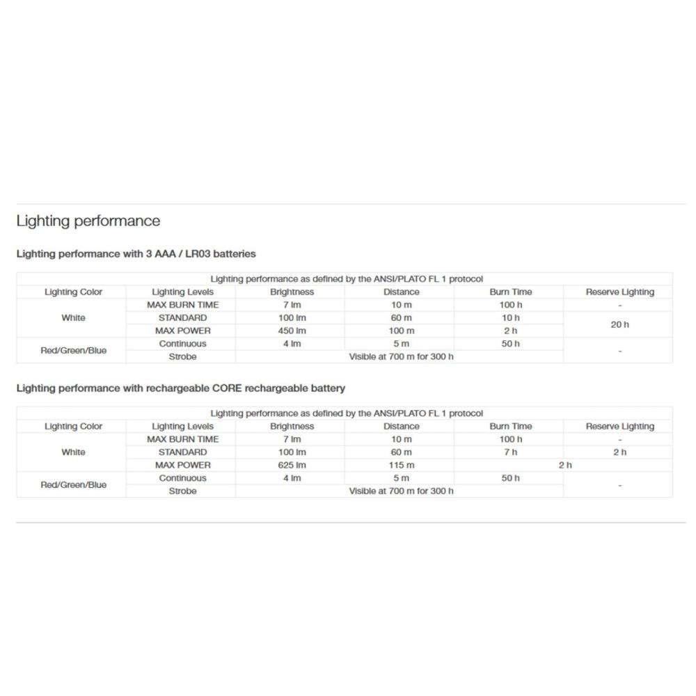 - Svietidlo rozpozná zdroj energie a optimalizuje svetelný tok: s dobíjacím akumulátorom CORE poskytuje svietidlo vyšší svetelný tok (625 lm v režime MAX POWER) a po celú dobu používania.
