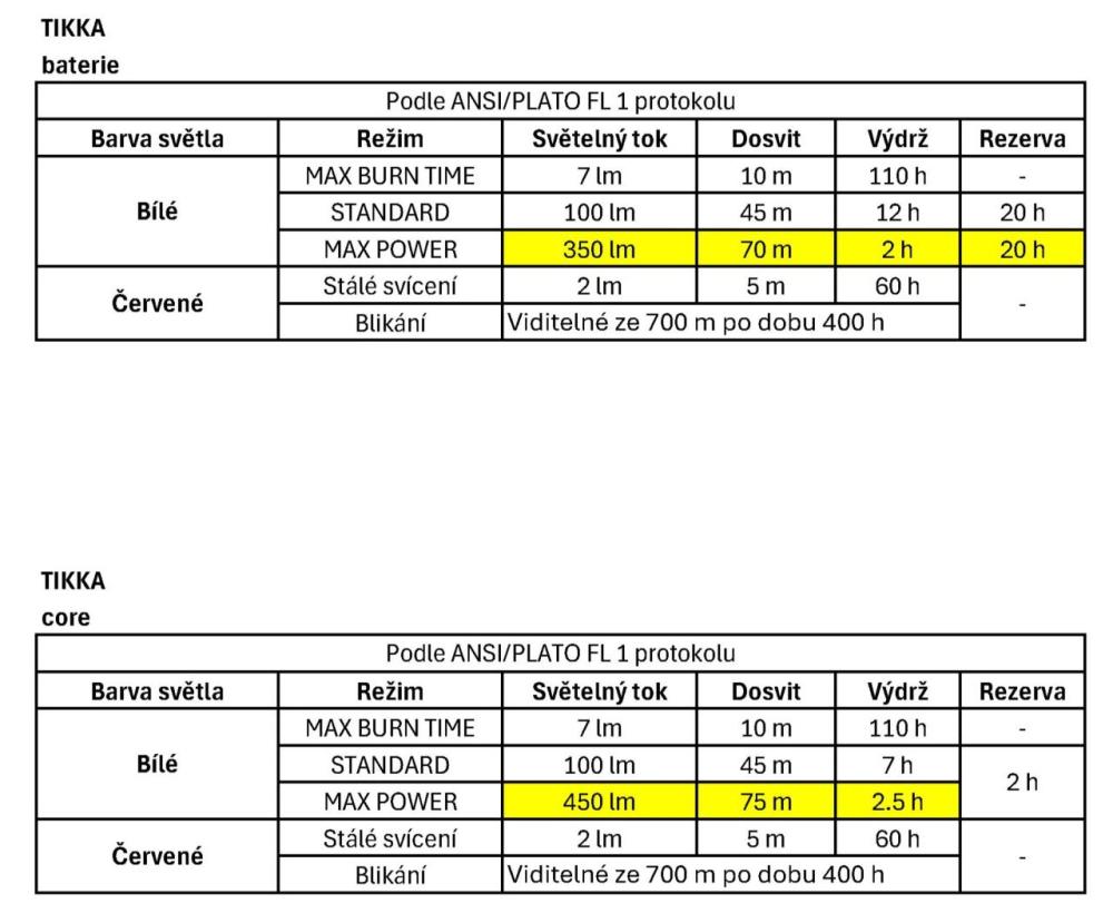 - Technológia HYBRID CONCEPT: TIKKA sa dodáva s 3 štandardnými batériami AAA/LR03 a je kompatibilná s dobíjacím akumulátorom CORE (nie je súčasťou balenia); čelovka automaticky rozpozná zdroj energie a upraví svetelný výstup
