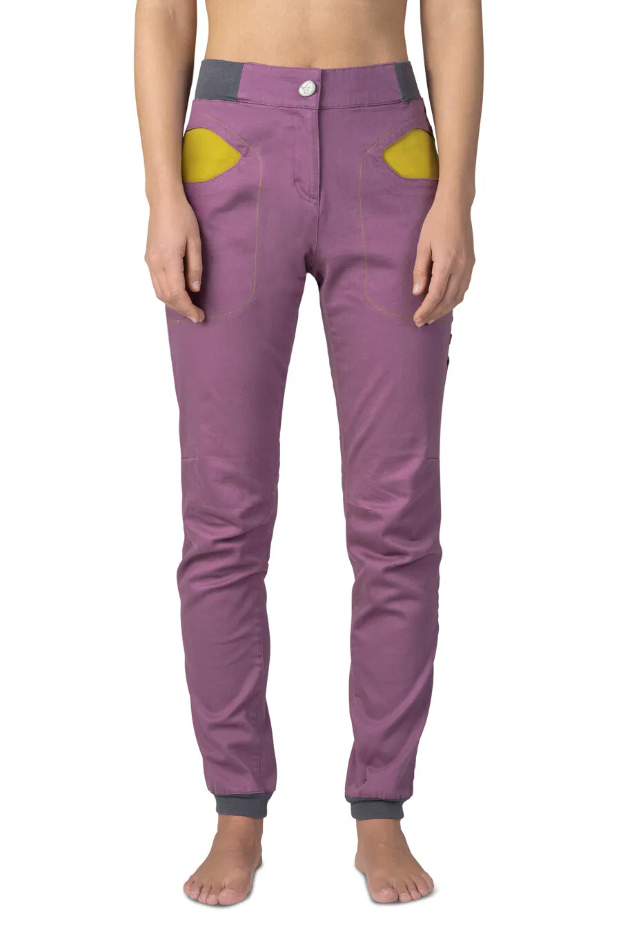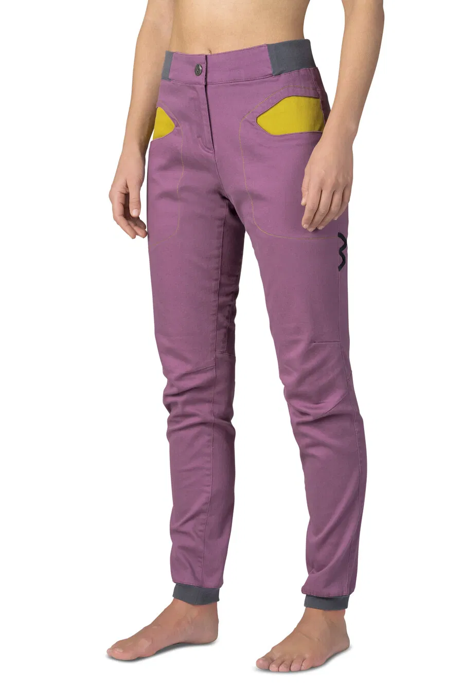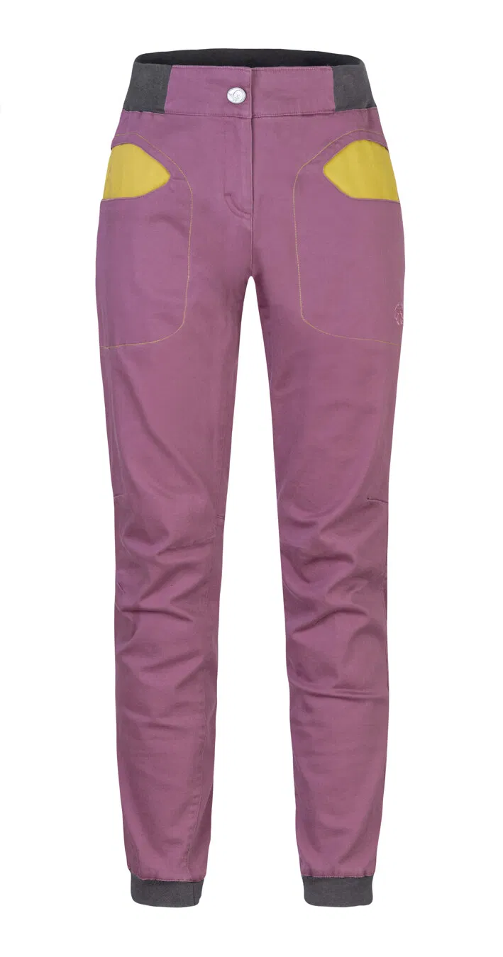 Dámske horolezecké nohavice Rafiki Sierra, civilnejšieho vzhľadu z pevnej bavlnenej tkaniny, ktorá vydrží aj hrubšie zaobchádzanie.