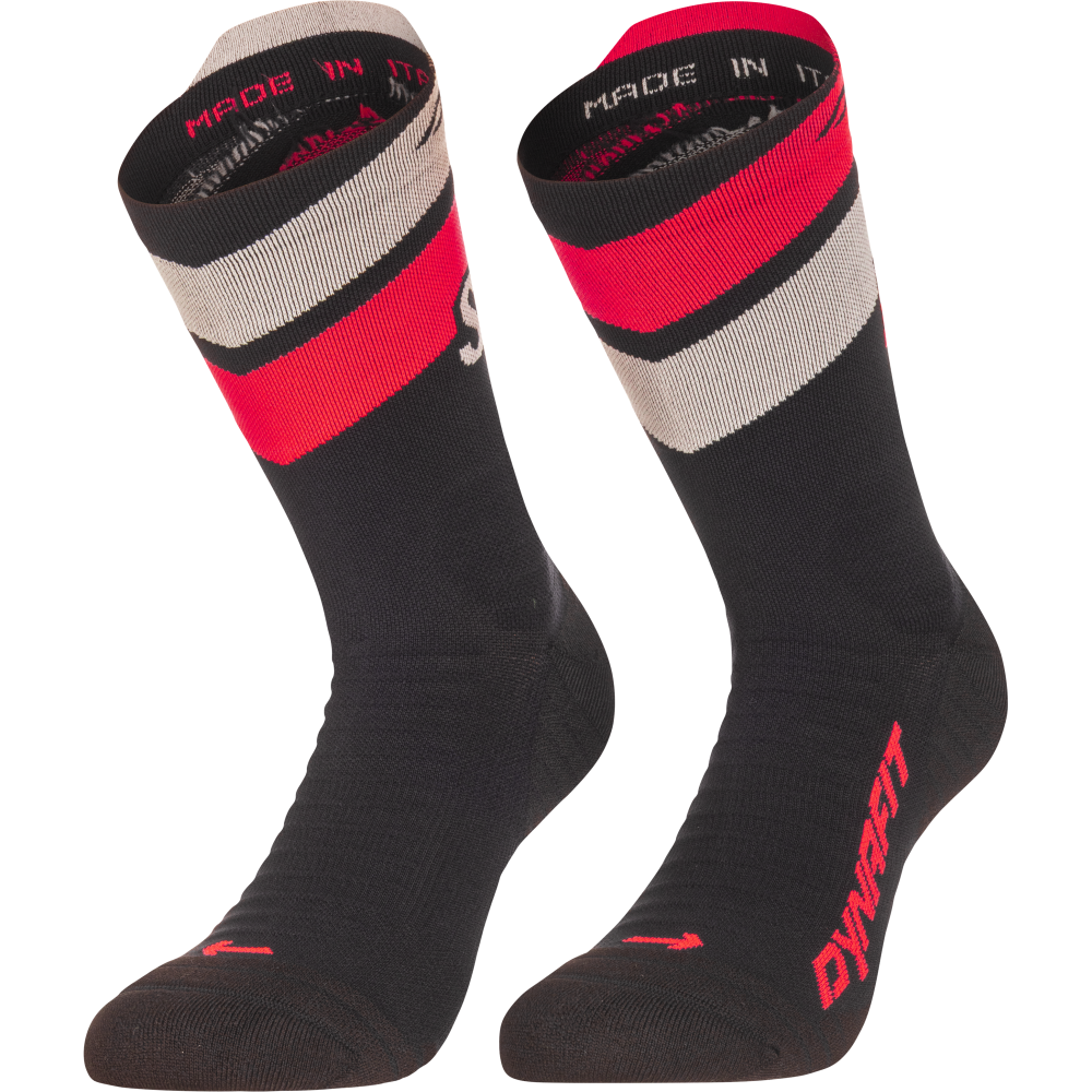 Bežecké ponožky Dynafit Ultra Crew Socks black out/ultra coral do terénu s maximálnym odpružením pre ochranu a pohodlie na dlhých vzdialenostiach.