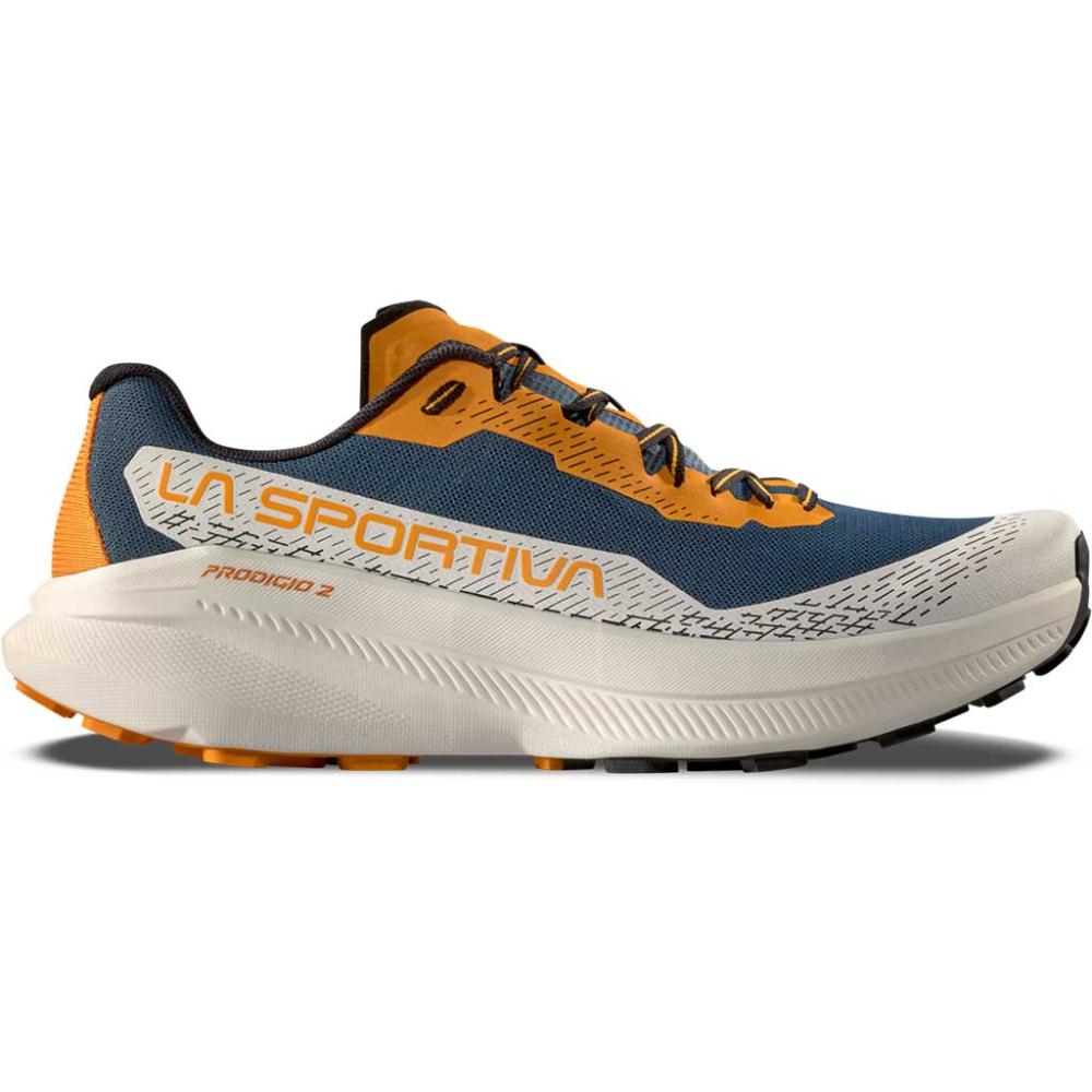 Moderná bežecká trailová obuv La Sportiva Prodigio 2 hurricane/chalk, navrhnutá pre dlhé vzdialenosti, technický trail a dynamický pohyb v teréne.